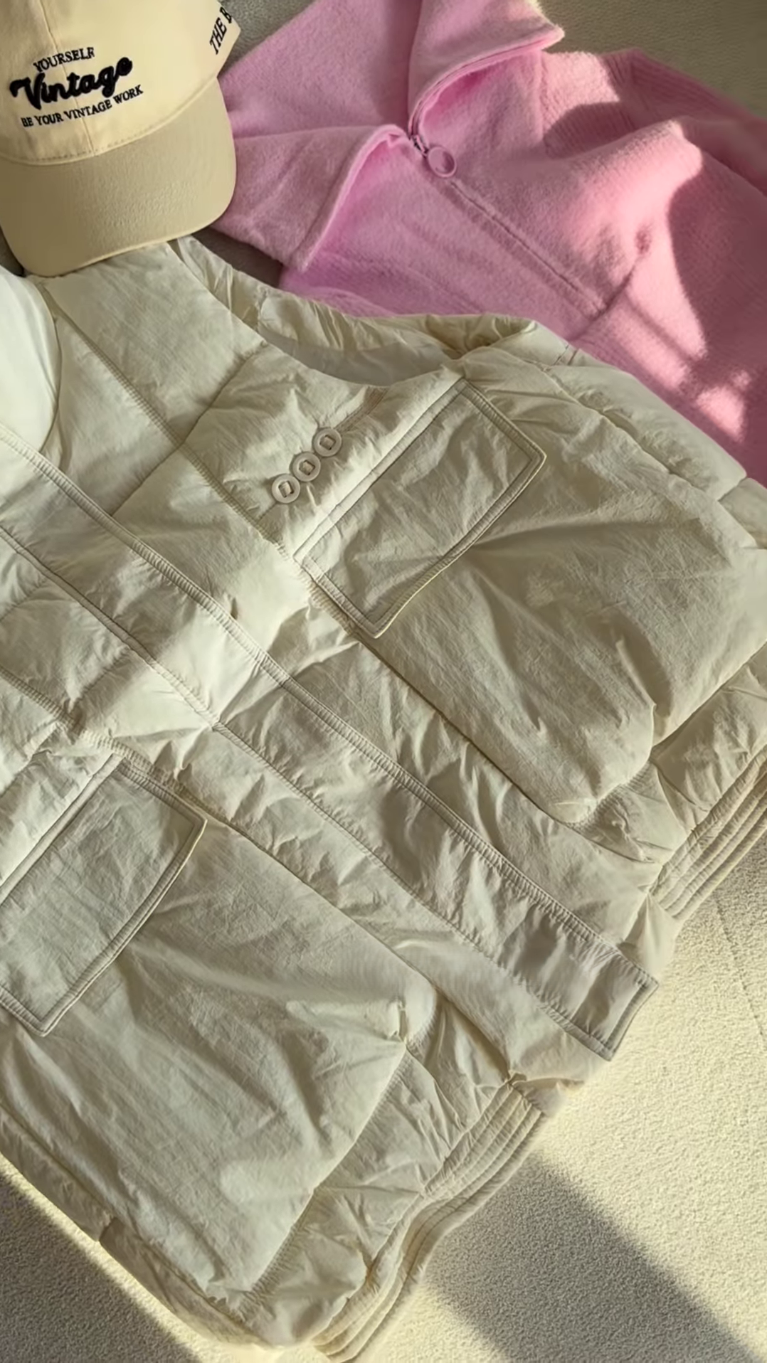 At the heart of the ensemble lies a quilted brown vest, lightweight yet structured, designed to keep you warm without compromising on style. Its padded design, practical front pockets, and clean lines make it a versatile layering piece β perfect over chunky knits, slim turtlenecks, or flowy dresses. The neutral brown tone radiates a grounded, natural charm, blending effortlessly with both casual and refined outfits. π§₯π€