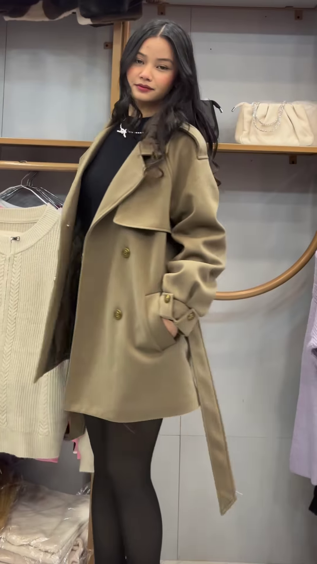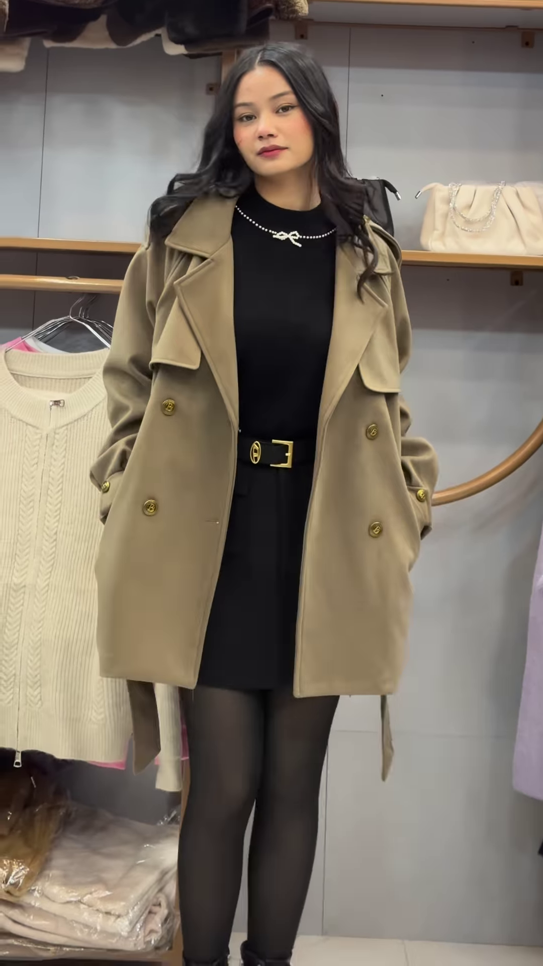 Step into a world where timeless elegance meets modern sophistication with this captivating outfit that blends deep tones and refined textures. The centerpiece is a structured green trench coat, its tailored silhouette effortlessly draping with poise and grace. The double-breasted detail, polished buttons, and waist tie create a bold yet feminine charm, making it the perfect outerwear for both daytime strolls and evening soirées. 🌿✨