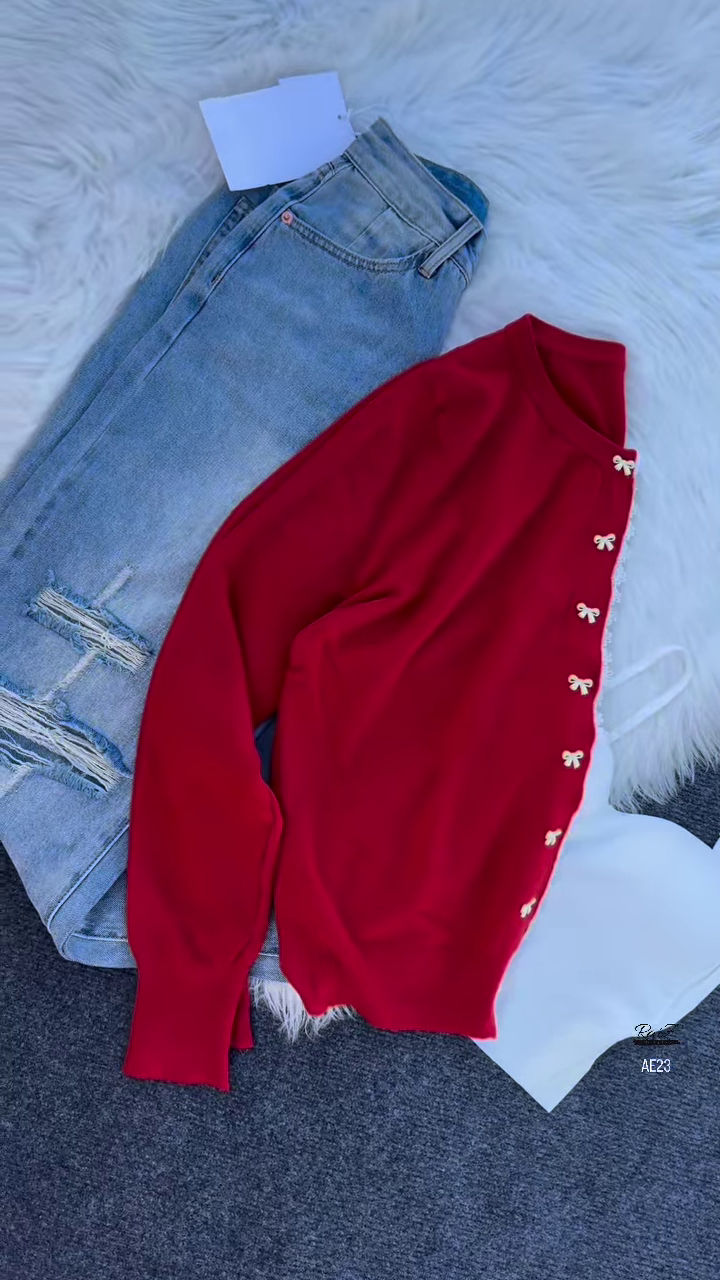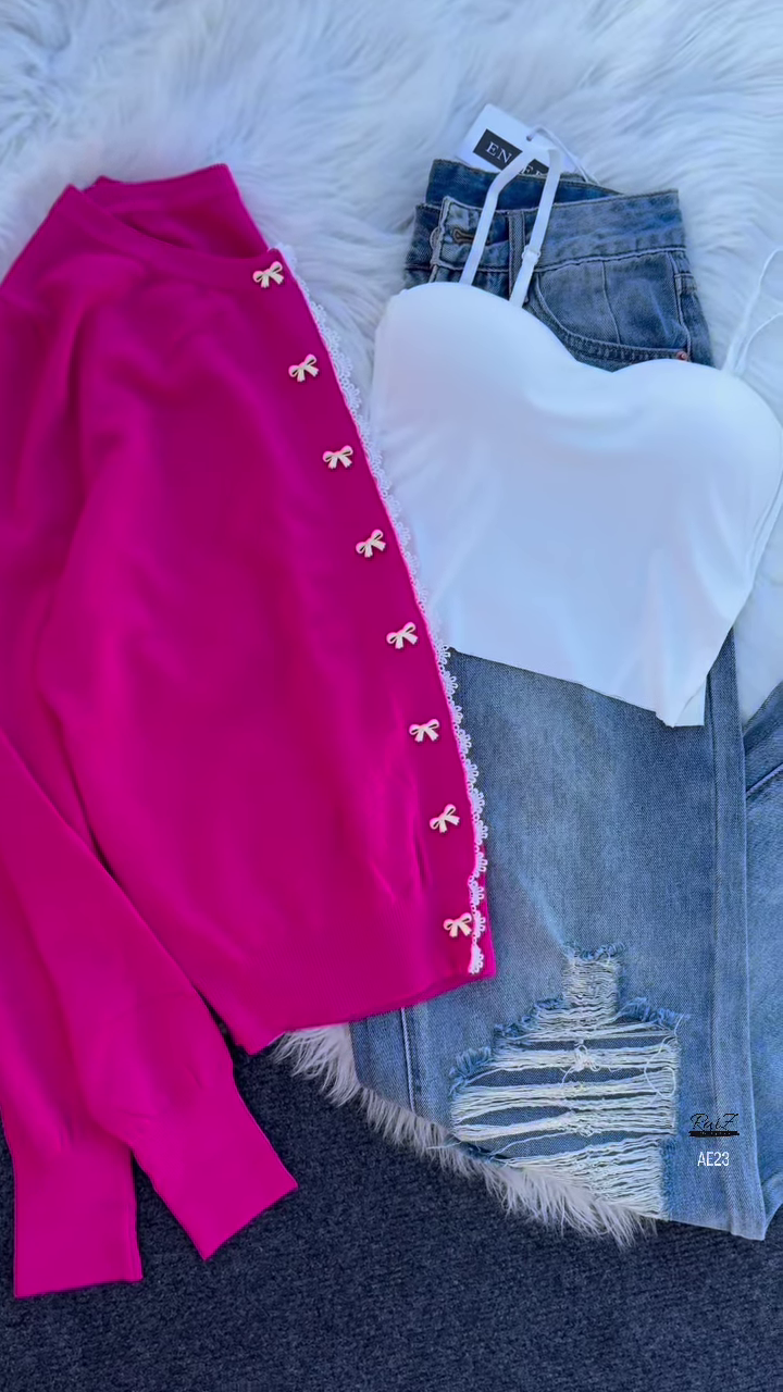 Bow-accent cardigans are currently trending for their balance of sweet nostalgia and modern styling potential. This fashion-forward piece can be styled open for a relaxed, breezy feel or buttoned for extra warmth and definition. The white camisole provides a clean foundation and can be swapped with pastel tanks or graphic tees for even more versatility. Mixing the cardigan’s soft pastel hue with bold accessories, such as colorful headbands or statement earrings, can create a personalized, standout look that celebrates individuality and creative expression.
